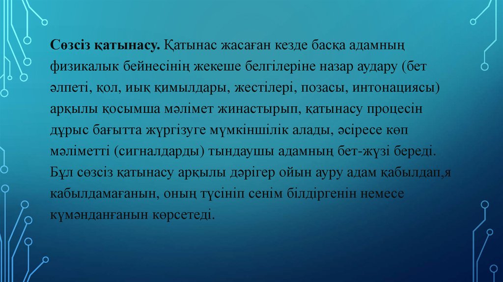 Сөзсіз қатынасу. Қатынас жасаған кезде басқа адамныңфизикалык бейнесінің жекеше белгілеріне назар аудару (бет