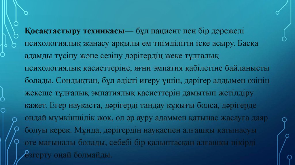 Дәрігер ауру адамға моральдық жағынан да қолдау көрсету қажет. Дәрігер мен ауру адамдардыңарасындағы қарым-қатынас белгілі бір жүйеге түсу үшін дәрігердің де бойында адами қасиеттер