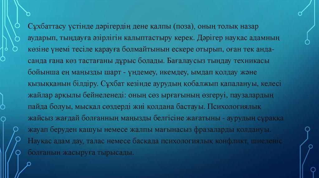 Сұхбаттасу үстінде дәрігердің дене қалпы (поза), оның толық назараударып, тыңдауға әзірлігін калыптастыру керек. Дәрігер науқас адамның