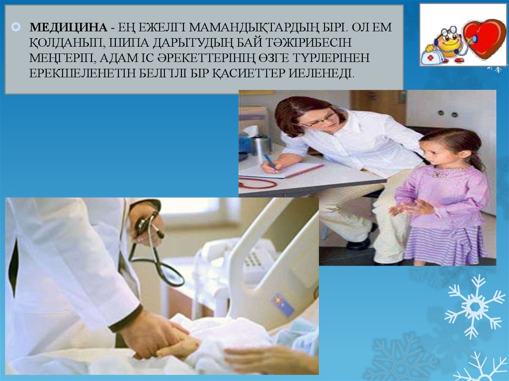 МЕДИЦИНА - ЕҢ ЕЖЕЛГІ МАМАНДЫҚТАРДЫҢ БІРІ. ОЛ ЕМҚОЛДАНЫП, ШИПА ДАРЫТУДЫҢ БАЙ ТӘЖІРИБЕСІН