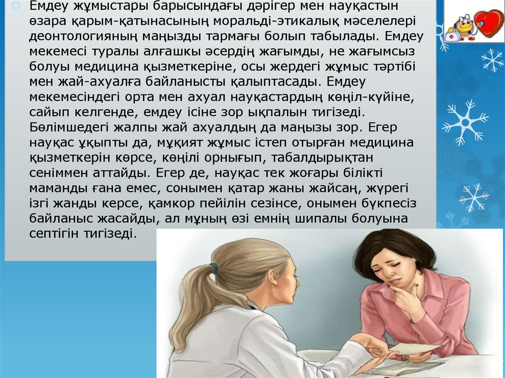 Емдеу жұмыстары барысындағы дәрігер мен науқастынөзара қарым-қатынасының моральді-этикалық мәселелері