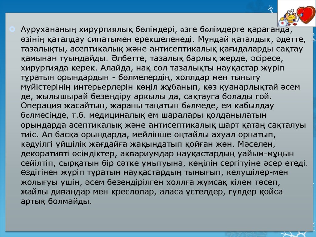 Аурухананың хирургиялық бөлімдері, ѳзге бѳлімдерге қарағанда,өзінің қаталдау сипатымен ерекшеленеді. Мұндай қаталдык, әдетте,