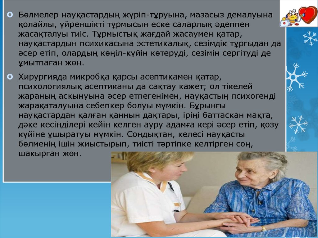 Бөлмелер науқастардың жүріп-тұруына, мазасыз демалуынақолайлы, үйреншікті тұрмысын еске саларлық әдеппен