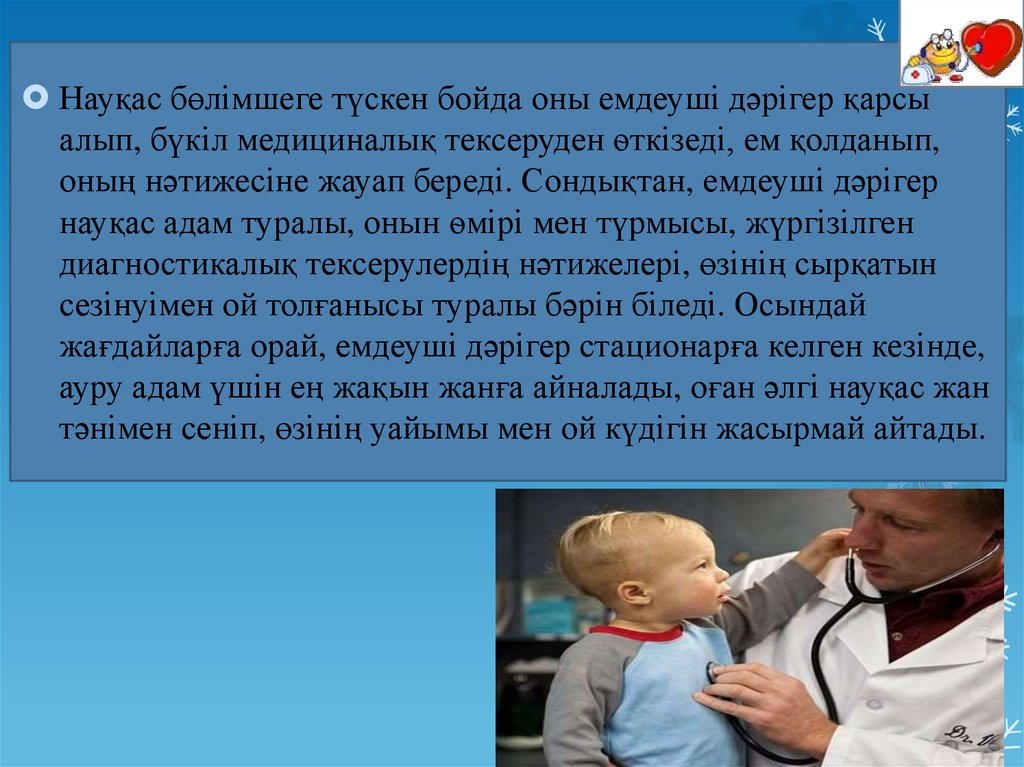 Науқас бөлімшеге түскен бойда оны емдеуші дәрігер қарсыалып, бүкіл медициналық тексеруден ѳткізеді, ем қолданып,
