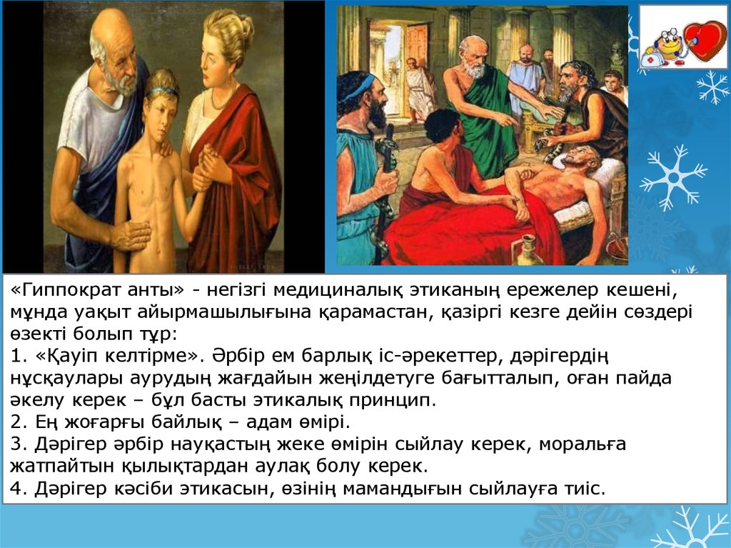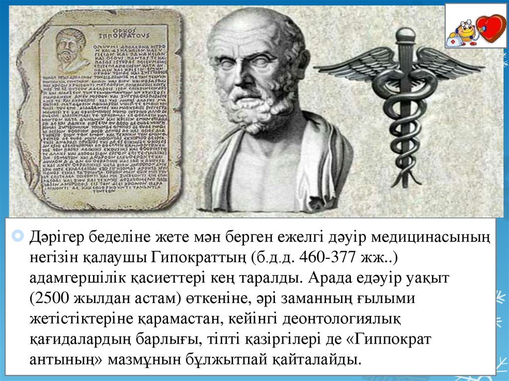 Дәрігер беделіне жете мән берген ежелгі дәуір медицинасыныңнегізін қалаушы Гипократтың (б.д.д. 460-377 жж..)