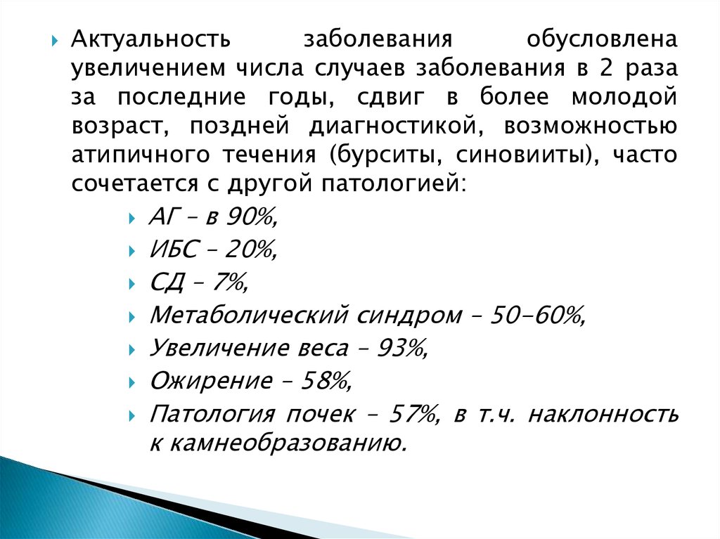 Заболеваемость подагрой в различных регионахсоставляет от 0,1 – 3,5%, а у мужчин в возрасте