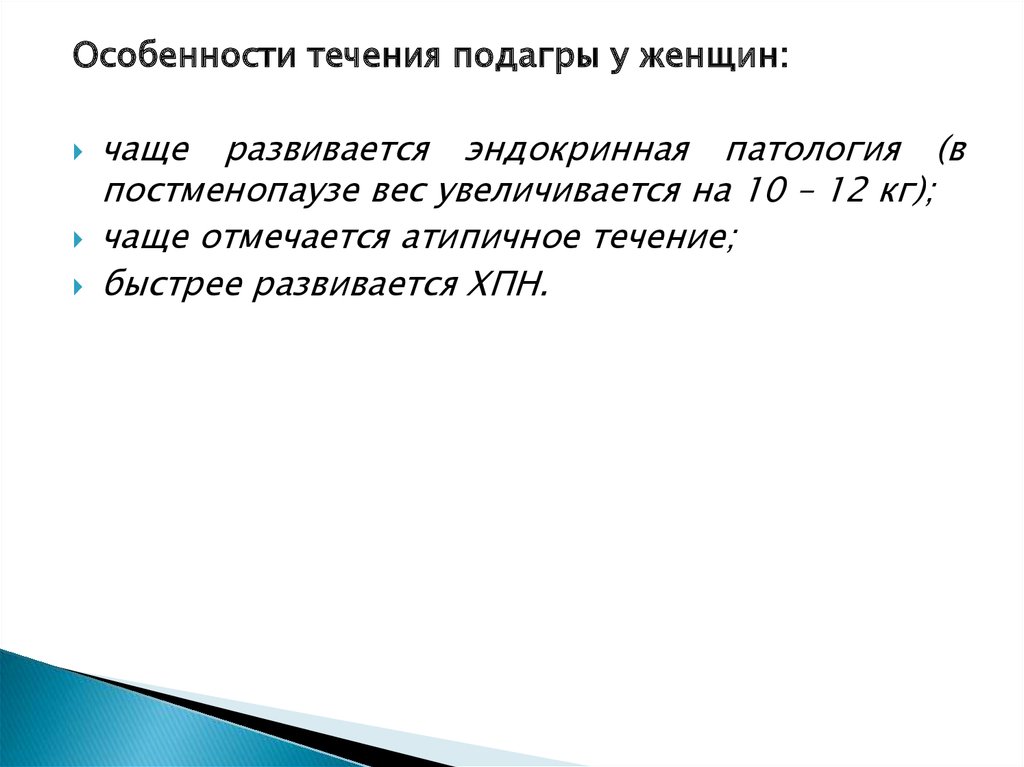 Особенности течения подагры у женщин:чаще развивается эндокринная патология (в
