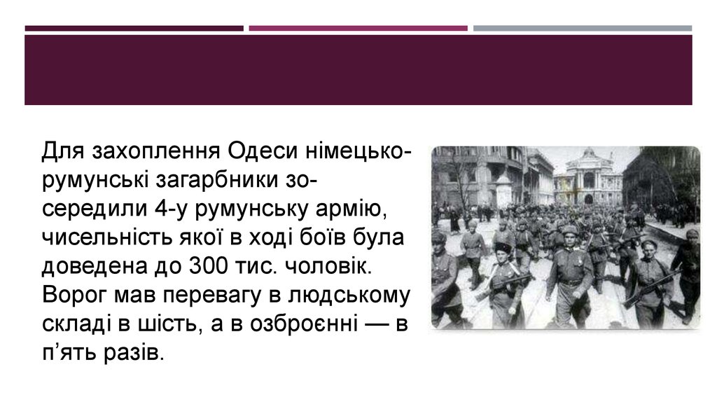 Для захоплення Одеси німецькорумунські загарбники зосередили 4-у румунську армію,чисельність якої в ході боїв була