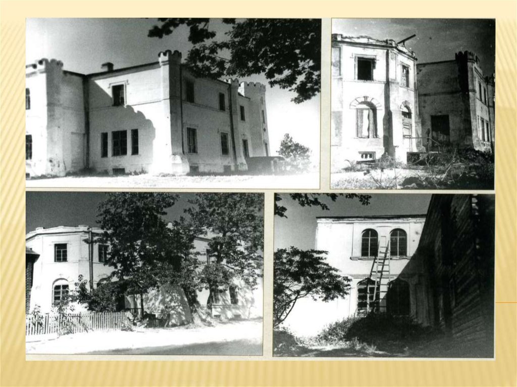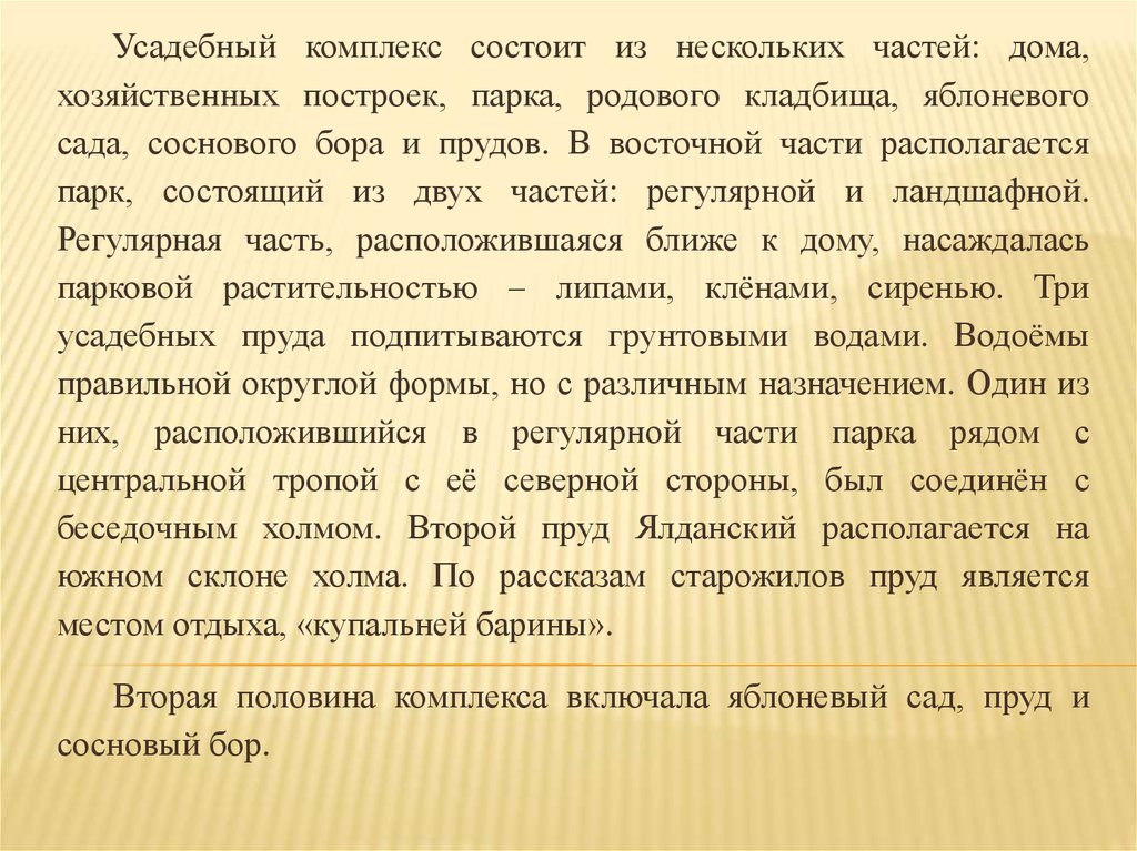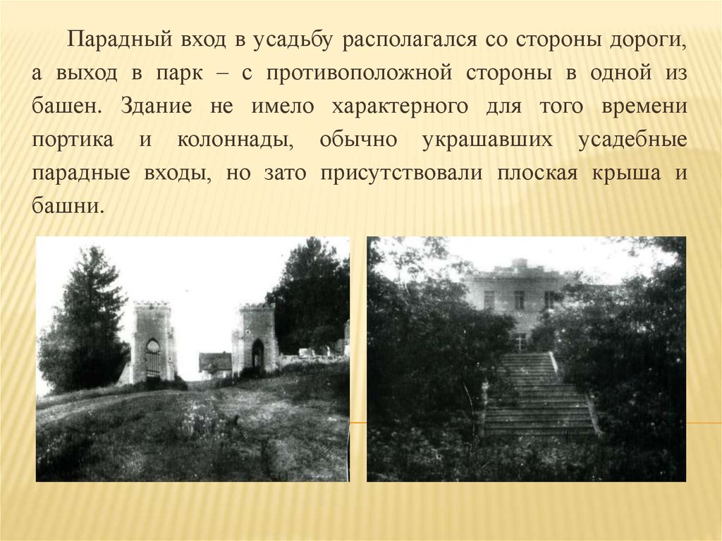 Парадный вход в усадьбу располагался со стороны дороги,а выход в парк – с противоположной стороны в одной из