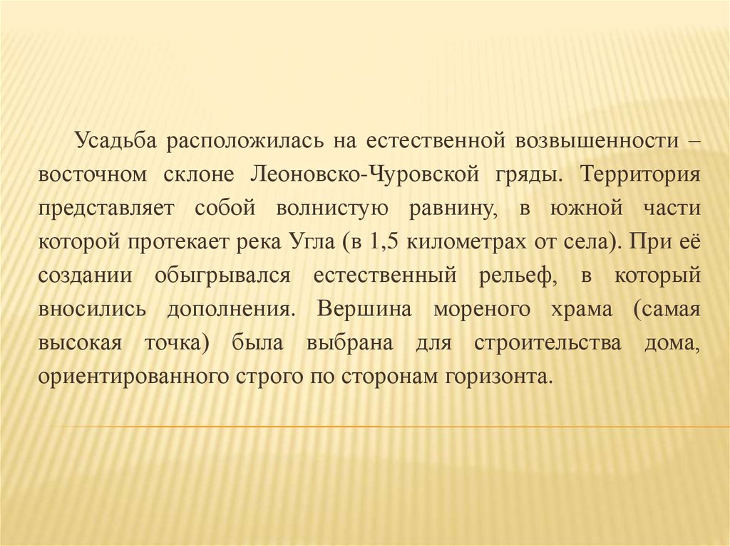 Усадьба расположилась на естественной возвышенности –восточном склоне Леоновско-Чуровской гряды. Территория