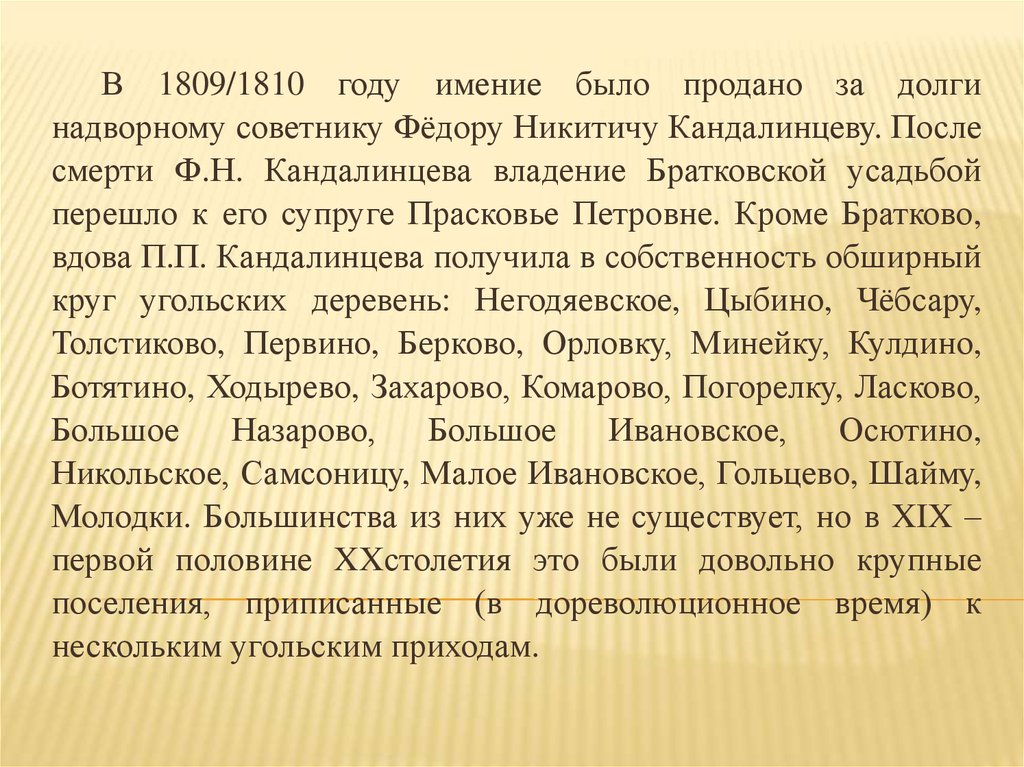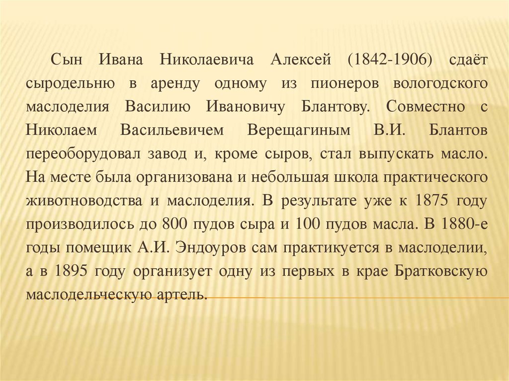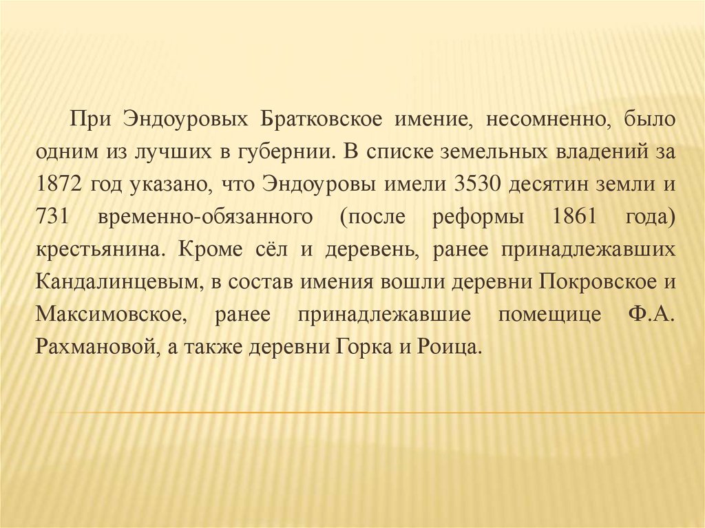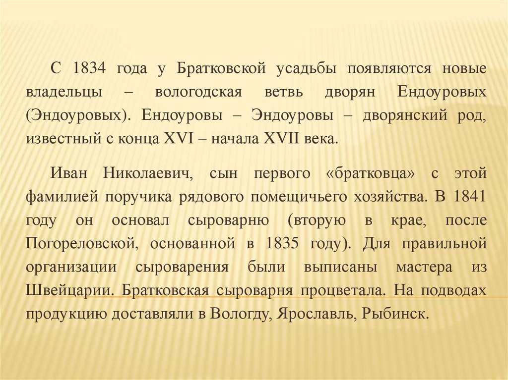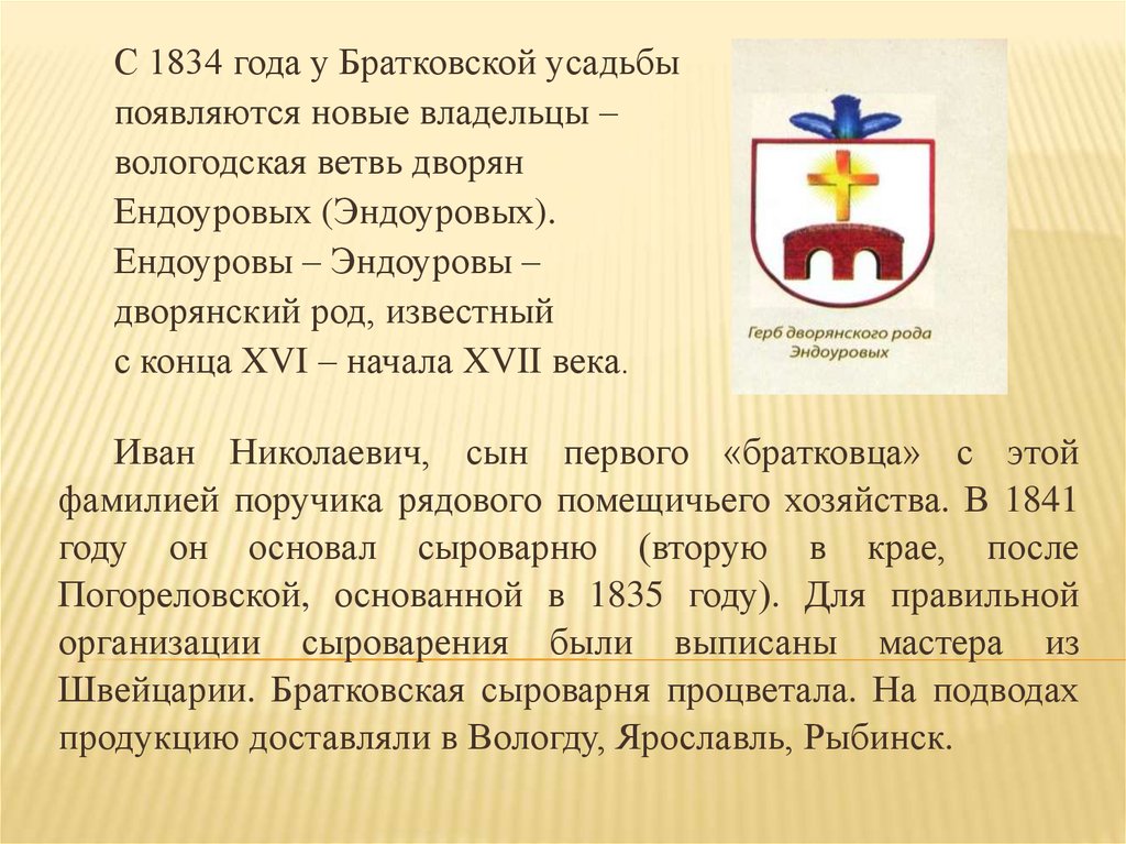 С 1834 года у Братковской усадьбы появляются новыевладельцы – вологодская ветвь дворян Ендоуровых