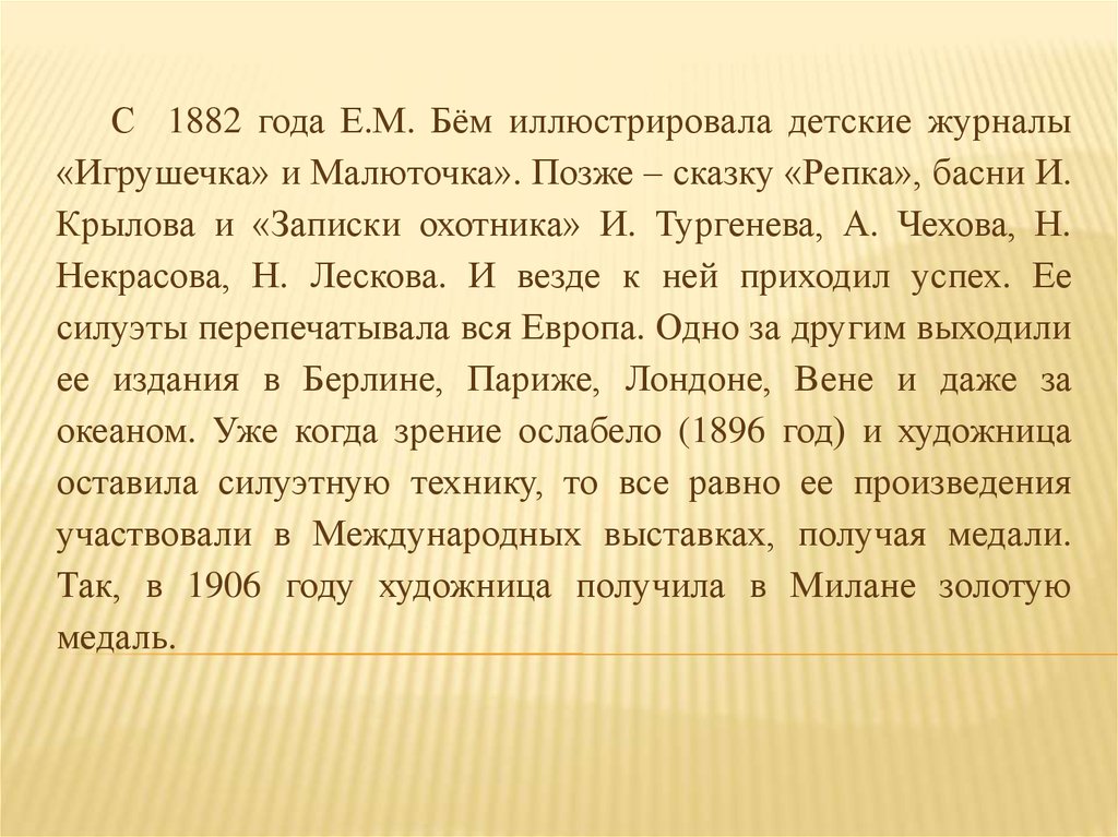 С 1882 года Е.М. Бём иллюстрировала детские журналы«Игрушечка» и Малюточка». Позже – сказку «Репка», басни И.