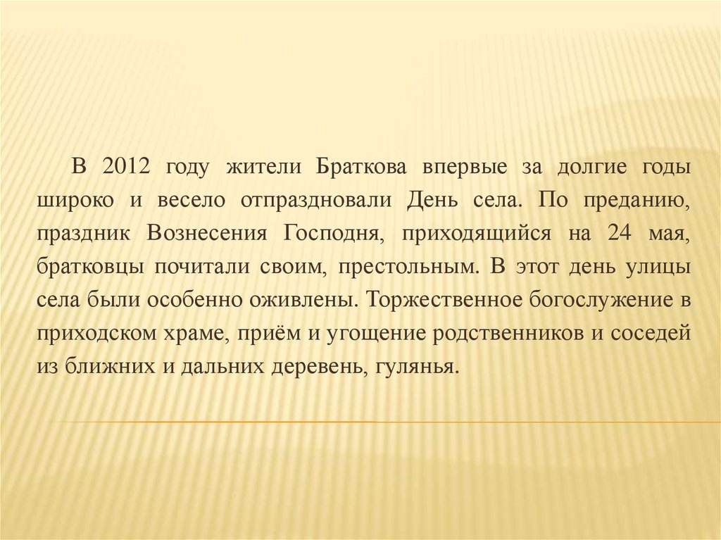 В 2012 году жители Браткова впервые за долгие годышироко и весело отпраздновали День села. По преданию,