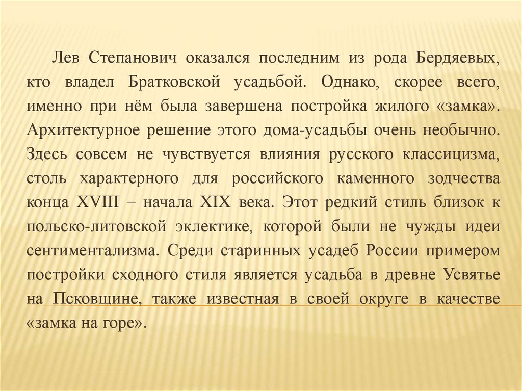 Лев Степанович оказался последним из рода Бердяевых,кто владел Братковской усадьбой. Однако, скорее всего,