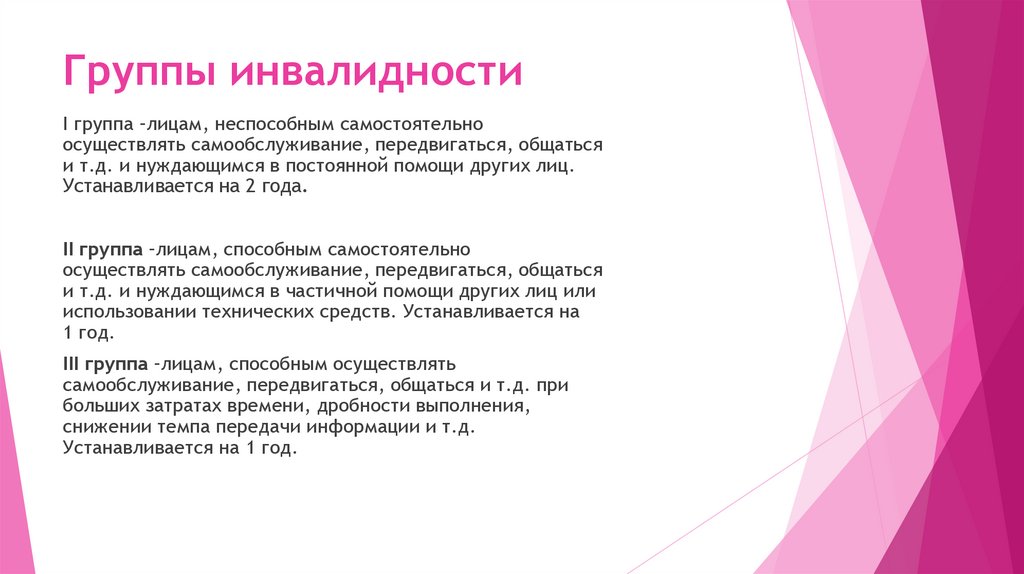 Группы инвалидностиI группа –лицам, неспособным самостоятельно