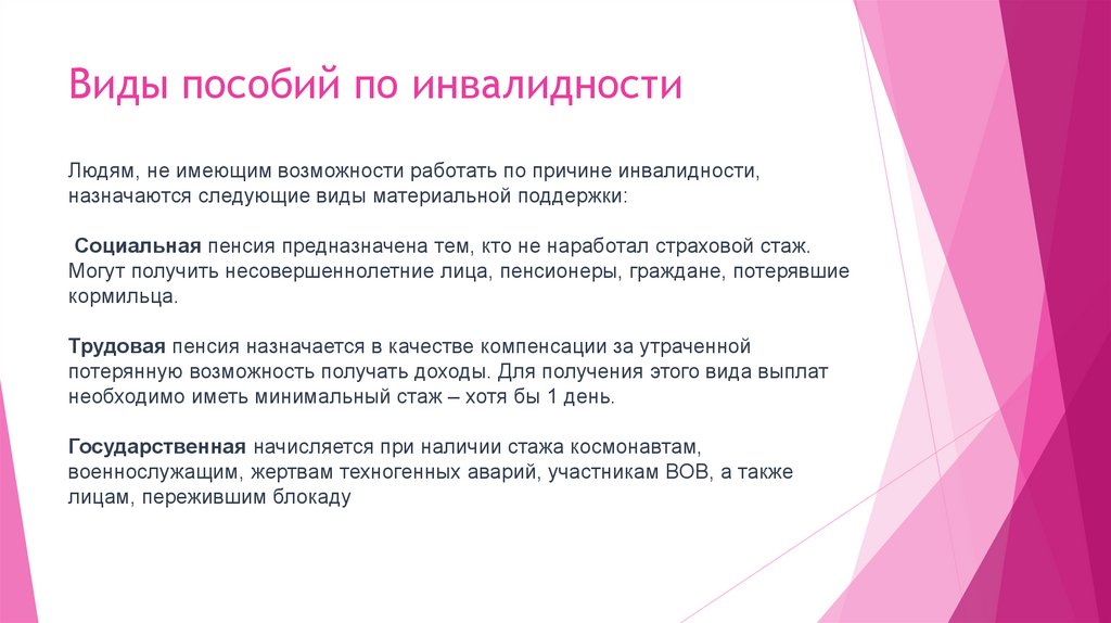 Виды пособий по инвалидностиЛюдям, не имеющим возможности работать по причине инвалидности,