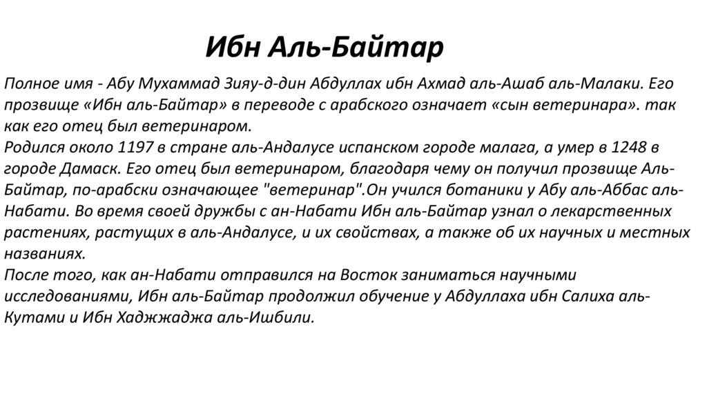 Ибн Аль-БайтарПолное имя - Абу Мухаммад Зияу-д-дин Абдуллах ибн Ахмад аль-Ашаб аль-Малаки. Его