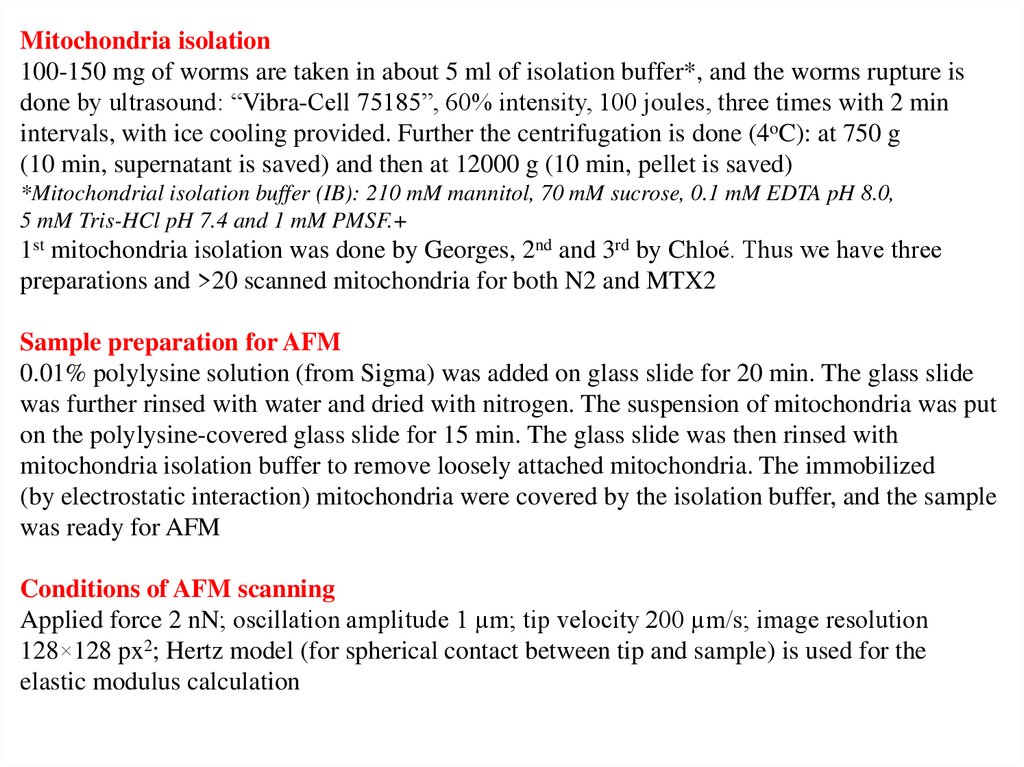 Mitochondria isolation100-150 mg of worms are taken in about 5 ml of isolation buffer*, and the worms rupture is