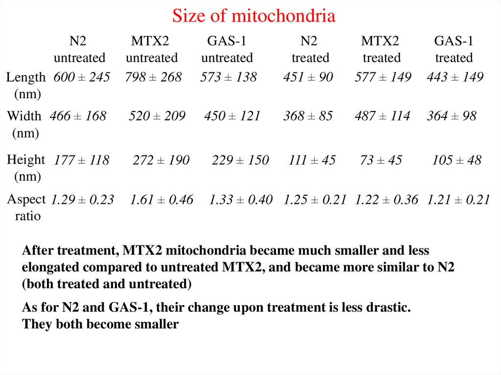 - MTX2 after treatment show very few asymmetrical mitochondria (so we observe
