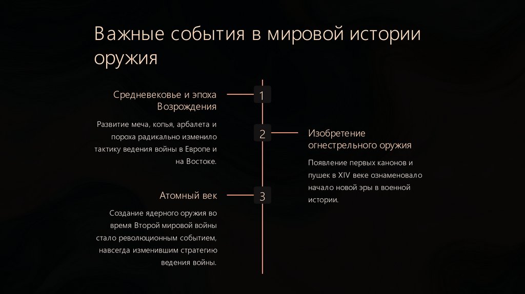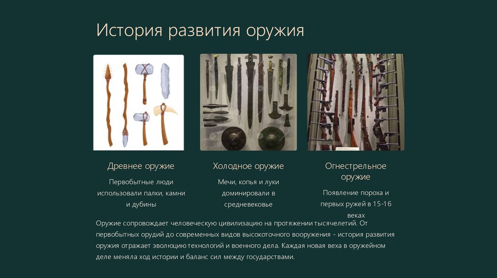 оружия отражает эволюцию технологий и военного дела. Каждая новая веха в оружейном