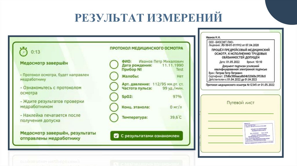 пульса, термометрии и содержания паров этанола