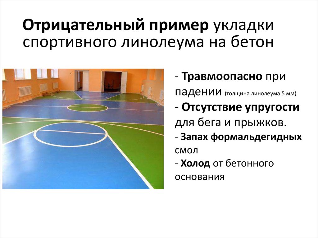 Отрицательный пример укладкиспортивного линолеума на бетон