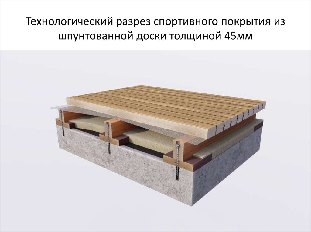 Технологический разрез спортивного покрытия изшпунтованной доски толщиной 45мм