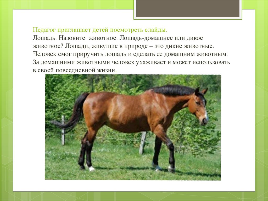 Педагог приглашает детей посмотреть слайды.Лошадь. Назовите животное. Лошадь-домашнее или дикое
