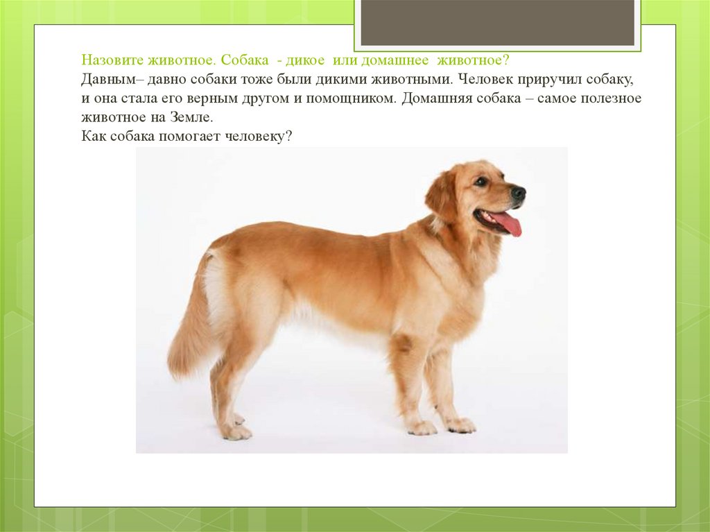 Назовите животное. Собака - дикое или домашнее животное?Давным– давно собаки тоже были дикими животными. Человек приручил собаку,