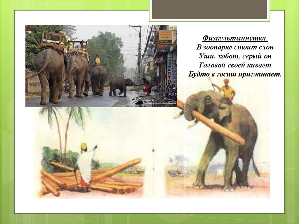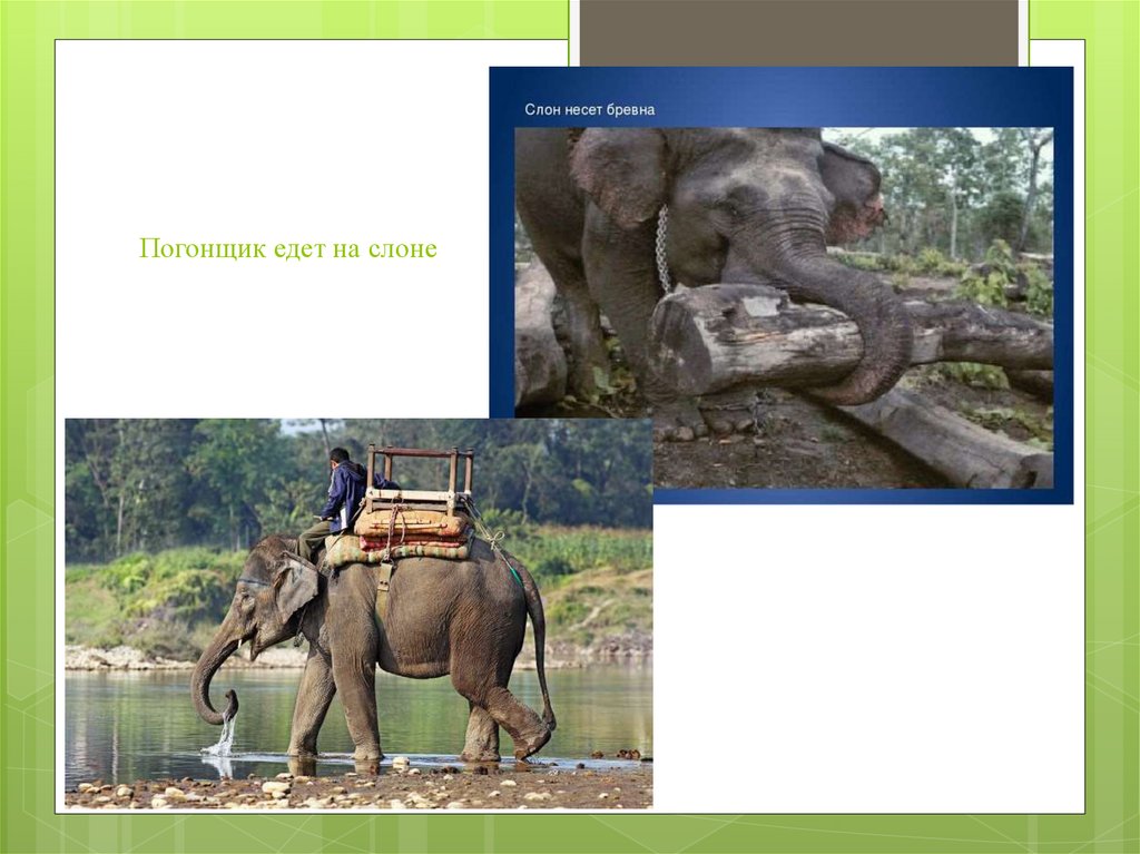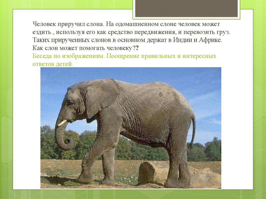 Человек приручил слона. На одомашненном слоне человек можетездить , используя его как средство передвижения, и перевозить груз.