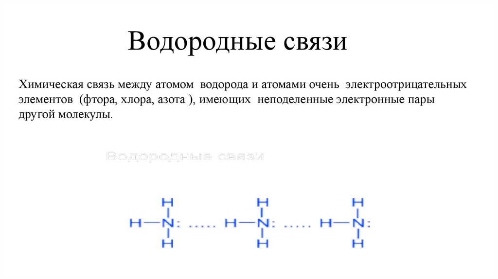 Водородные связиХимическая связь между атомом водорода и атомами очень электроотрицательных
