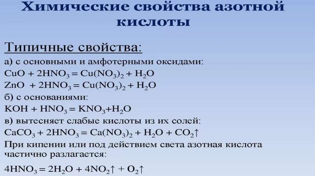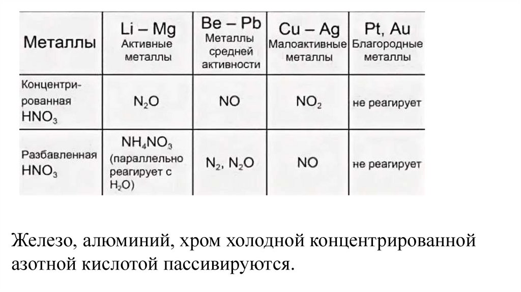 Железо, алюминий, хром холодной концентрированнойазотной кислотой пассивируются.