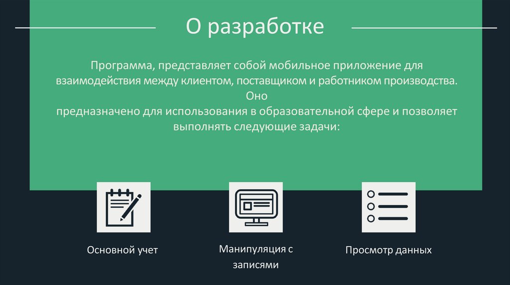 О разработкеПрограмма, представляет собой мобильное приложение для