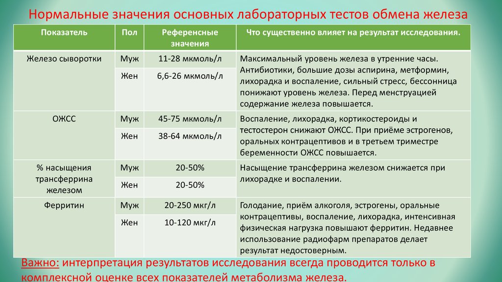 Нормальные значения основных лабораторных тестов обмена железаПоказатель
