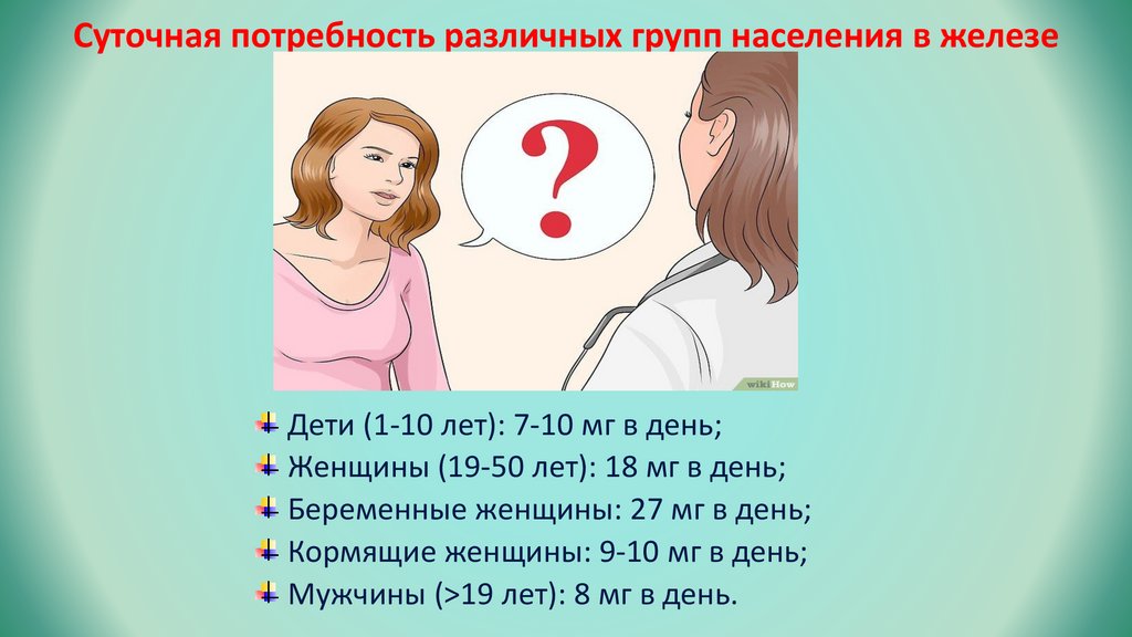 Суточная потребность различных групп населения в железеДети (1-10 лет): 7-10 мг в день;