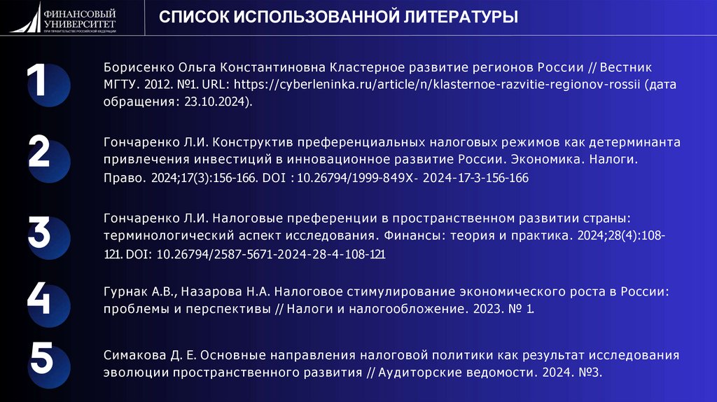 СПИСОК ИСПОЛЬЗОВАННОЙ ЛИТЕРАТУРЫБ о р и с е н к о Ольга Константиновна Кластерное развитие р ег и о но в Р о с с и и // Вестник