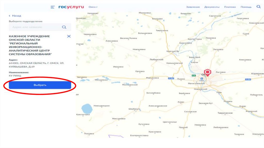 Нажимаете на название учреждения, послеэтого появляется кнопка выбрать