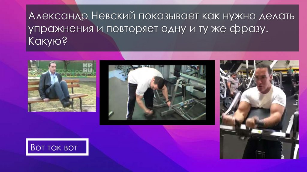 Александр Невский показывает как нужно делатьупражнения и повторяет одну и ту же фразу.