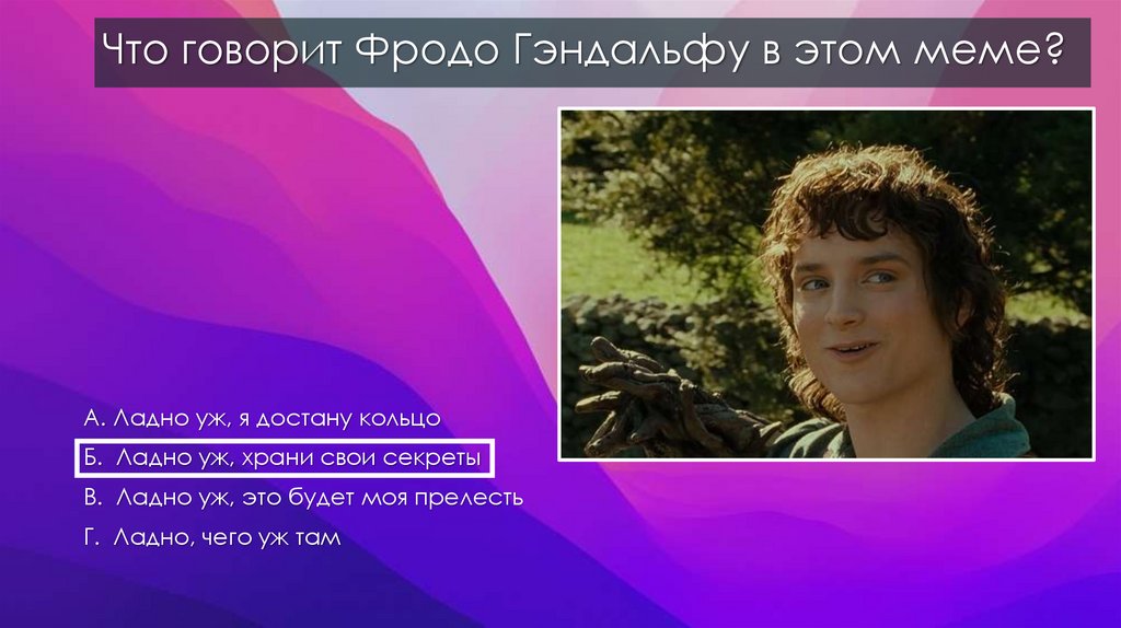 Что говорит Фродо Гэндальфу в этом меме?А. Ладно уж, я достану кольцо