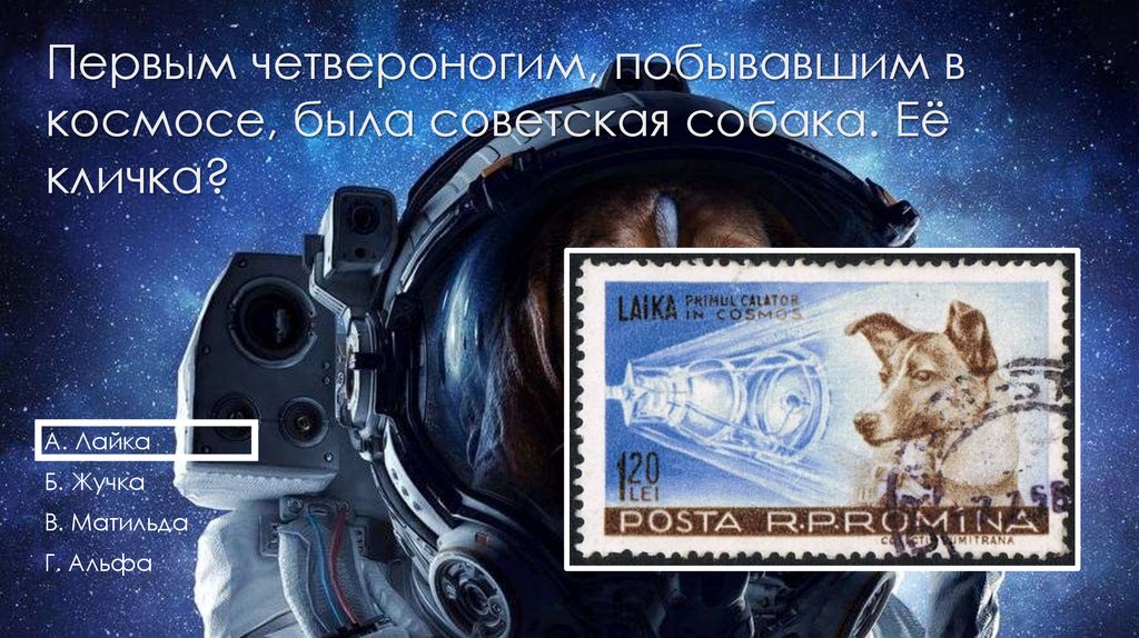 Первым четвероногим, побывавшим вкосмосе, была советская собака. Её