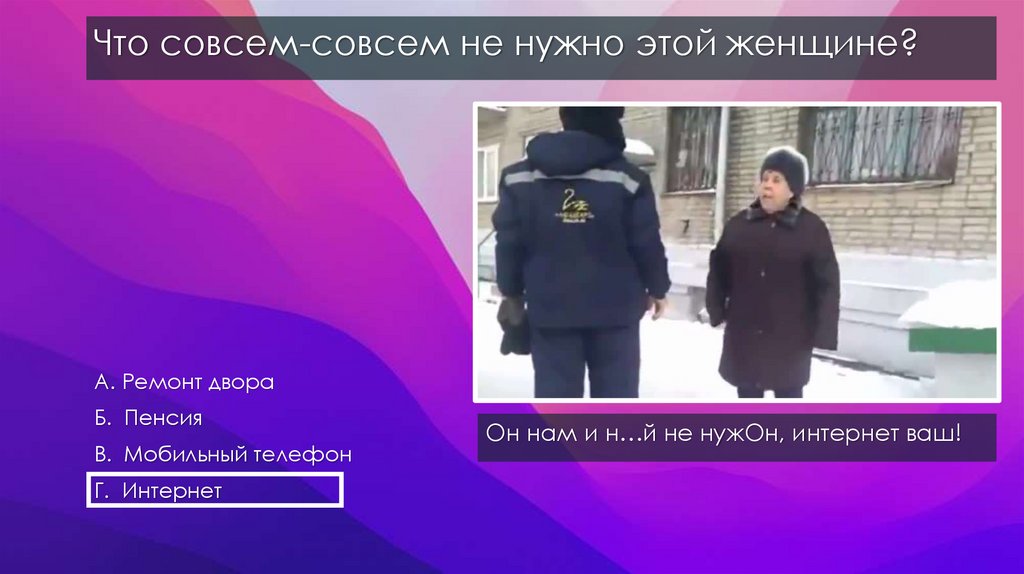 Что совсем-совсем не нужно этой женщине?А. Ремонт двора