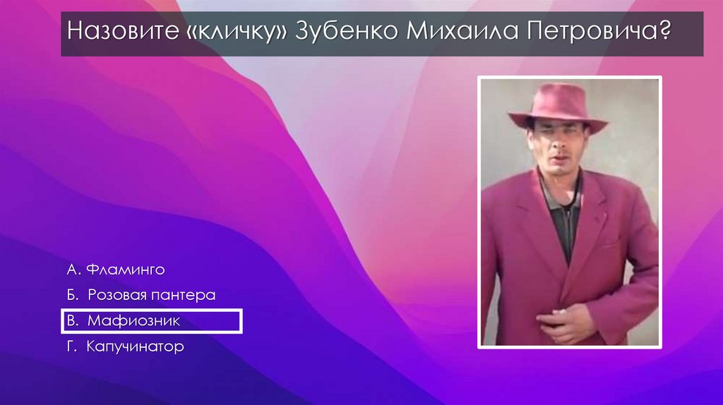 Назовите «кличку» Зубенко Михаила Петровича?А. Фламинго