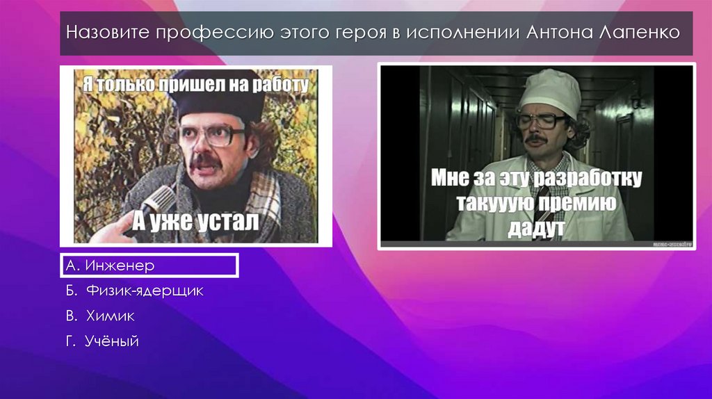 Назовите профессию этого героя в исполнении Антона ЛапенкоА. Инженер