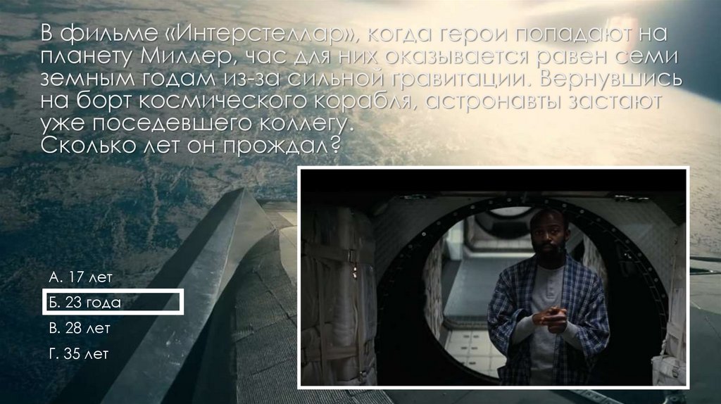 В фильме «Интерстеллар», когда герои попадают напланету Миллер, час для них оказывается равен семи