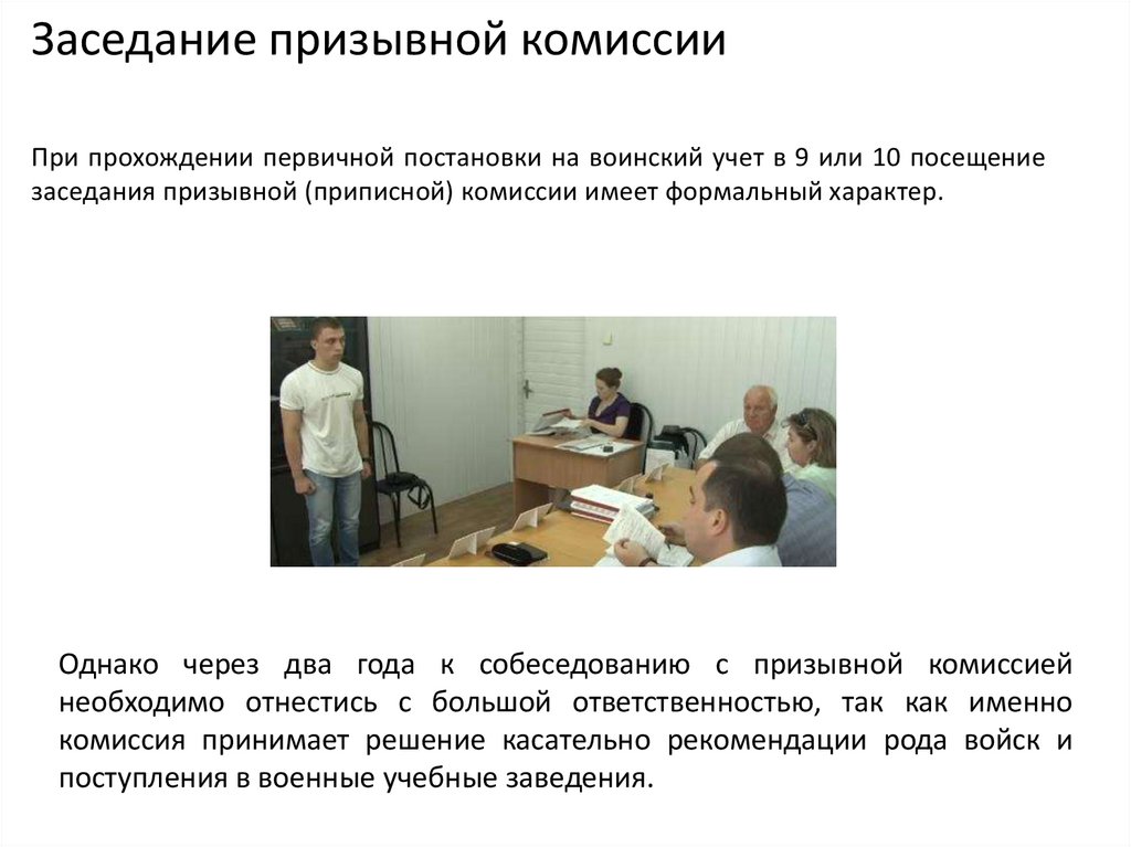 Заседание призывной комиссииПри прохождении первичной постановки на воинский учет в 9 или 10 посещение