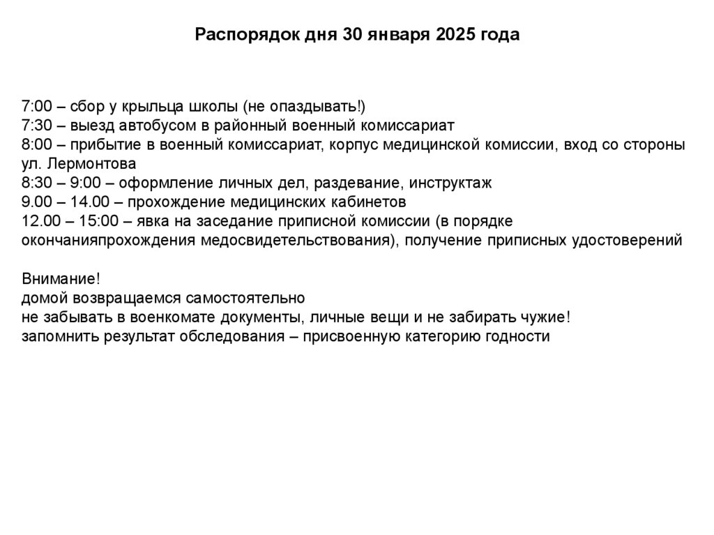 Распорядок дня 30 января 2025 года7:00 – сбор у крыльца школы (не опаздывать!)