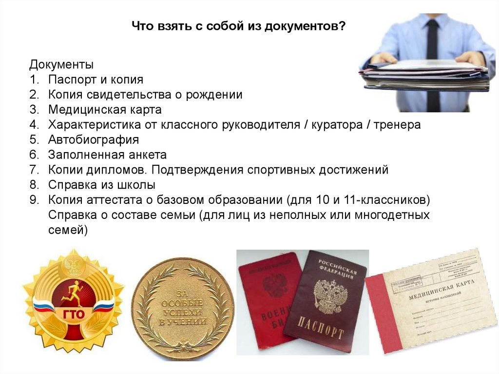 документы об образовании, подтверждения спортивных и учебных достижений,