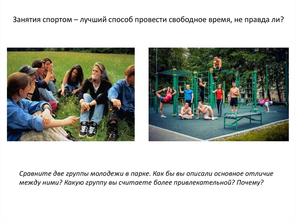 Занятия спортом – лучший способ провести свободное время, не правда ли?Сравните две группы молодежи в парке. Как бы вы описали основное отличие