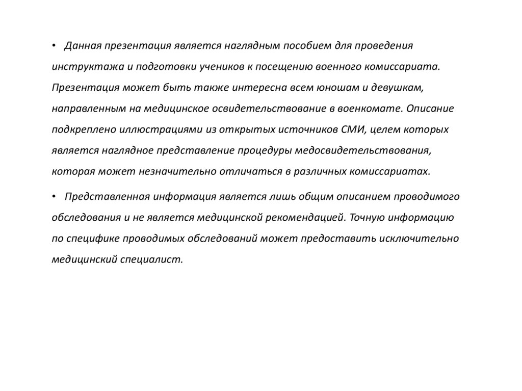 • Данная презентация является наглядным пособием для проведенияинструктажа и подготовки учеников к посещению военного комиссариата.