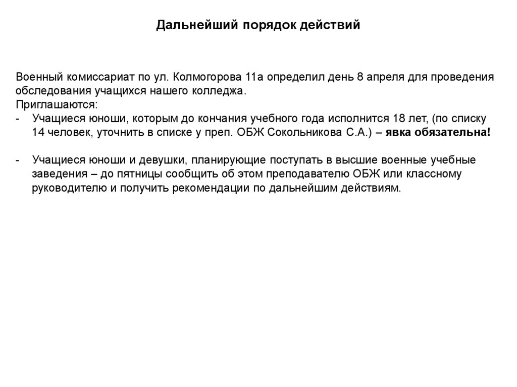 Дальнейший порядок действийВоенный комиссариат по ул. Колмогорова 11а определил день 8 апреля для проведения